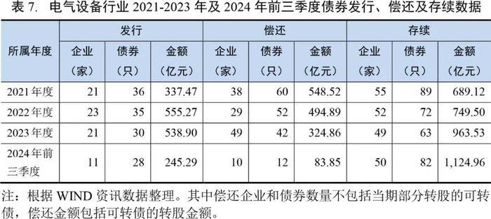 2021-2023年及2024年前三季度,电气设备行业债券融资净额分别为-211.05亿元、60.38亿元、214.04亿元和161.44亿元,行业内资金需求的增长较为明显。行业内存在大量发行可转债的上市公司,转债转股以及触发价格后的回售、赎回等情况较多。2024年前三季度,行业内共11家企业新发债券,合计筹集资金245.29亿元,品种涵盖中期票据、公司债、超短期融资债券、可转债等,发行利率区间在0.01%-3.66%;当期共10家企业偿还债券,合计偿还83.85亿元。期末行业内存续债券余额为1,124.96亿元。