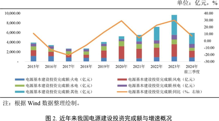 我国电源投资受政策影响大,在国家推进供给侧结构性改革以及力争实现“双碳”目标等背景下,电源结构持续向清洁能源倾斜,各类能源的投资增速分化加剧。2023年我国电源基本建设投资完成额为9,675.00亿元,同比增长30.10%,增速较上年上升7.30个百分点;其中,除火电投资增速较上年下降22.07个百分点外,其他类型电源投资增速均较上年明显提升,绿色低碳转型加速。同年,全国新增发电装机容量3.71亿千瓦,同比增长86.70%,增速较上年上升75.50个百分点。其中,新增并网太阳能发电2.18亿千瓦,同比增长146.60%,占同期全国总新增装机的比重为58.67%。截至2023年末,全国全口径发电装机容量为29.22亿千瓦,同比增长14.00%。其中,煤电装机容量为11.65亿千瓦,占比首次降至40.00%以下;并网太阳能发电装机容量约6.10亿千瓦,同比增长55.50%,并网风电装机容量约4.41亿千瓦,同比增长20.70%,新能源发电装机突破10亿千瓦。2024年前三季度,电源建设完成投资5,959.00亿元,同比增长7.20%;其中非化石能源发电投资占电源投资比重为85.60%。同期,全国新增发电装机容量2.40亿千瓦,同比多投产0.32亿千瓦;其中,风电和太阳能发电合计新增装机2.00亿千瓦,占新增发电装机总容量的比重达到82.40%。截至2024年9月末,全国全口径发电装机容量31.60亿千瓦,同比增长14.10%;其中非化石能源发电装机容量17.90亿千瓦,同比增长24.00%,占总装机容量比重为56.50%,较上年同期上升4.50个百分点。