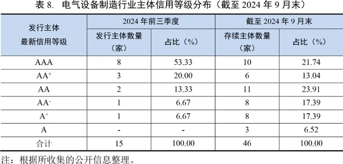 2024年前三季度,电气设备行业公开发行债券主体为15家,发债主体信用级别主要分布在AA+及以上级别。截至2024年9月末,电气设备行业存续的公开发行债券主体共计46家,其中AAA级主体10家,AA+级主体6家,AA级主体11家,AA-级主体8家,A+级主体8家,A级主体3家。2024年前三季度,行业内共1家发行人涉及主体级别调整。