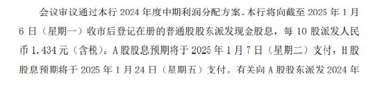 公司回答表示,尊敬的投资者:感谢您的关注。我行已于2024年12月2日召开2024年第三次临时股东大会,审议通过了《关于2024年度中期利润分配方案的议案》,A股股息于2025年1月7日支付。详情可参见我行刊载于上海证券交易所网站(sse.com.cn)的《中国工商银行股份有限公司2024年第三次临时股东大会决议公告》。