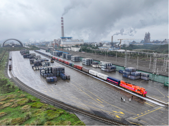 2024年11月19日,重庆市动力锂电池全国铁路试运首发班列在重庆长寿渝巴专用铁路等待发车(无人机照片)。新华社记者 唐奕 摄