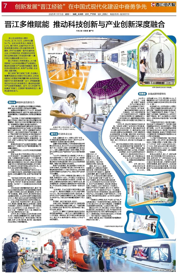 对科技创新与高质量发展的追求,激发了晋江企业加强科技创新和产业创新深度融合的积极性,着力补齐短板、拉长长板、锻造新板,向“新”向“质”自我超越。据悉,近年来,晋江有研发活动企业数量成倍增长,企业研发经费年均增速保持在20%以上,推动4家龙头企业参与承担国家科技项目,95%以上的省级科技项目立项来自民营企业。