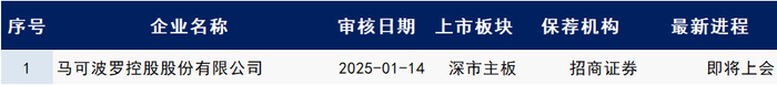 2025年1月7日深交所公告,马可波罗控股股份有限公司主板IPO将于2025年1月14日二次上会,保荐机构为招商证券股份有限公司,审计机构为容诚会计师事务所(特殊普通合伙),律师事务所为国浩律师(北京)事务所。