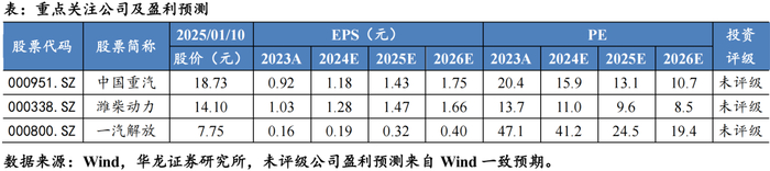 投资建议:重卡报废更新范围扩展,叠加窗口期拉长、用户更新意愿增强,2025年重卡销量有望进一步增长,维持行业“推荐”评级。个股方面,建议关注建议关注重卡产业链龙头公司中国重汽、潍柴动力和一汽解放等。