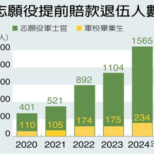 台军人力短缺问题持续亮红灯。据台媒报道,2025年度台防务预算书显示,台军志愿役人员预算员额是2020年来新低,且实际人力状况可能更低。2025年减少的预算员额中,全都是基层部队骨干的士官、上等兵和一等兵,甚至选择赔钱提前退伍的军士官人数由2020年的401人,至去年暴增到1565人,短短4年内狂升约4倍。