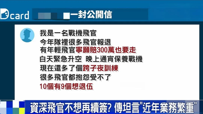 此前台媒就曾报道过多位台军现役飞行员在网上发文表达“退意”,直指台空军压力太大,待遇却不佳,大量飞行员不想再续签选择报退,甚至不少人宁愿赔钱也要离职。