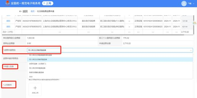 选择退费申请理由为“用人单位社保费误缴退费”,填写申请人名称等必录项,按要求上传附件材料。确认退费金额及信息无误后,点击【提交】。