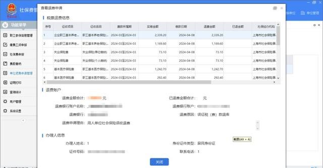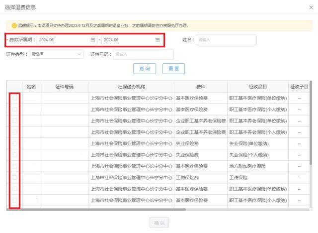 填写费款所属期及退费职工姓名、证件类型、证件号码等信息,点击【查询】,系统带出对应的待退费信息,对待退费信息进行勾选。