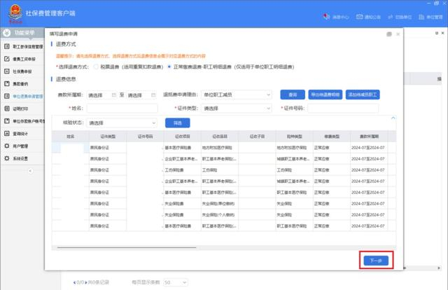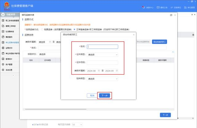 录入晚退保人员信息,选择准确的待退费所属期后点击【下一步】。