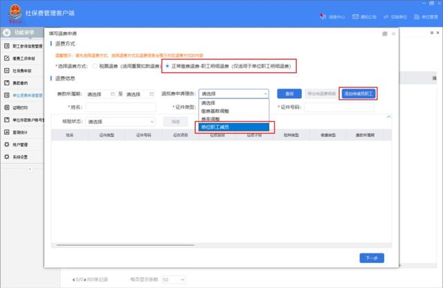 “退费方式”应选择【正常缴费退费】→【职工明细退费(仅适用于单位职工明细退费)】,退抵费申请理由选择【单位职工减员】,点击【添加待减员职工】。