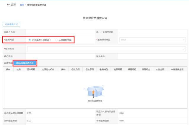 进入申请界面,【退费类型】选择【误收退费(全额退)】后点击【查询/选择退费信息】。