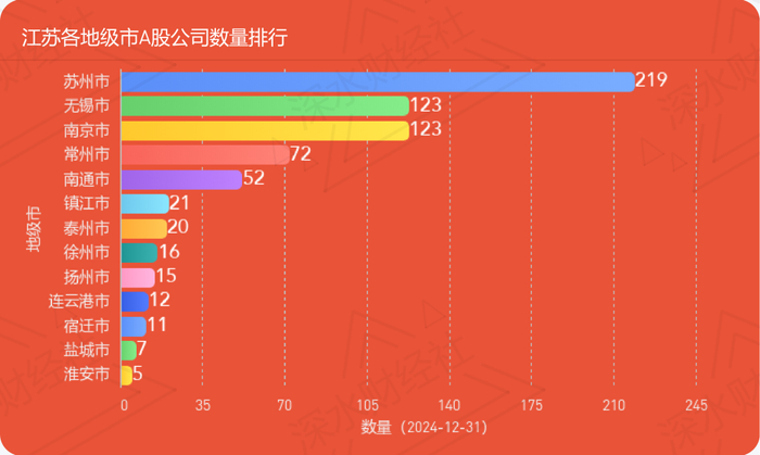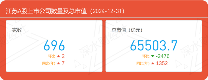 截至2024年12月31日,江苏共有696家A股公司,位居国内第3位。