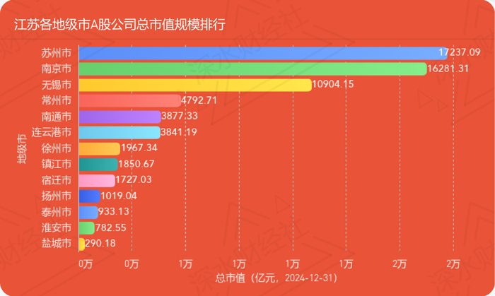 【市值宝】2024年江苏各城市A股公司数量及总市值排行榜