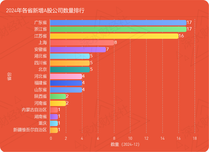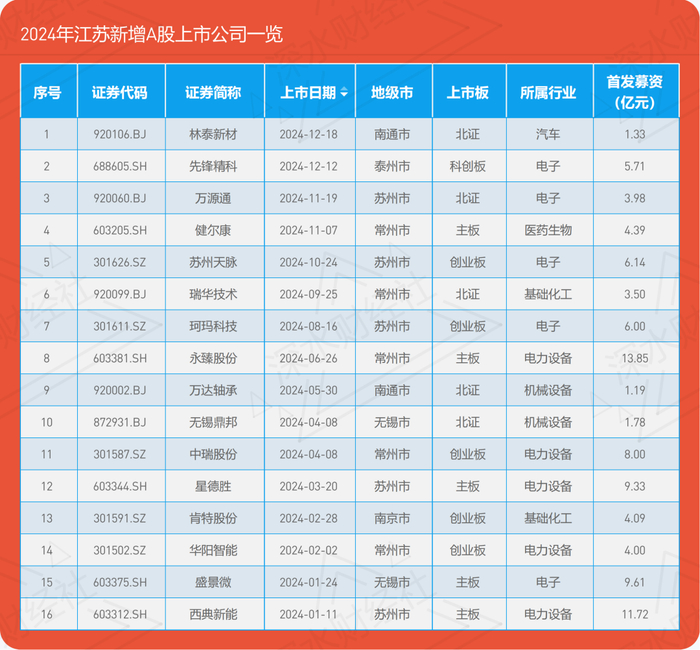 2024年江苏省共有16家公司在A股上市,新增A股公司数量位居国内第三位,2024年江苏共有8家A股公司退市。