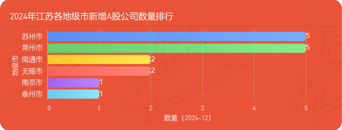 2024年苏州和常州市共有5家公司在A股上市,南通、无锡各有2家上市,南京和泰州各有1家。