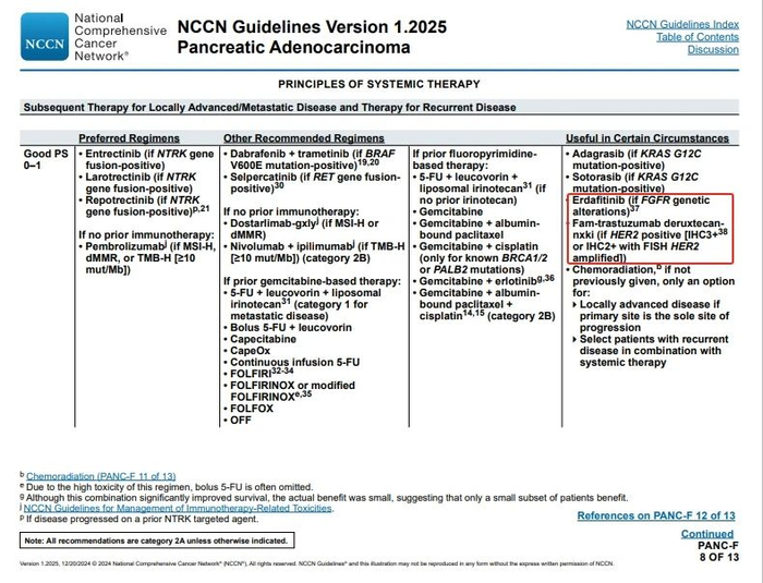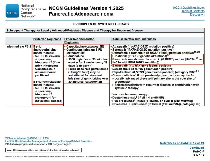 首先,对于体能状态良好(PS 0-1)的患者,指南新增了Erdafitinib,即对于FGFR基因改变的局晚期或转移性胰腺癌患者,Erdafitinib被新增为有用的治疗方案。FGFR基因的异常在部分胰腺癌患者中较为常见,Erdafitinib作为FGFR抑制剂,能够针对性地抑制肿瘤细胞的生长和增殖。