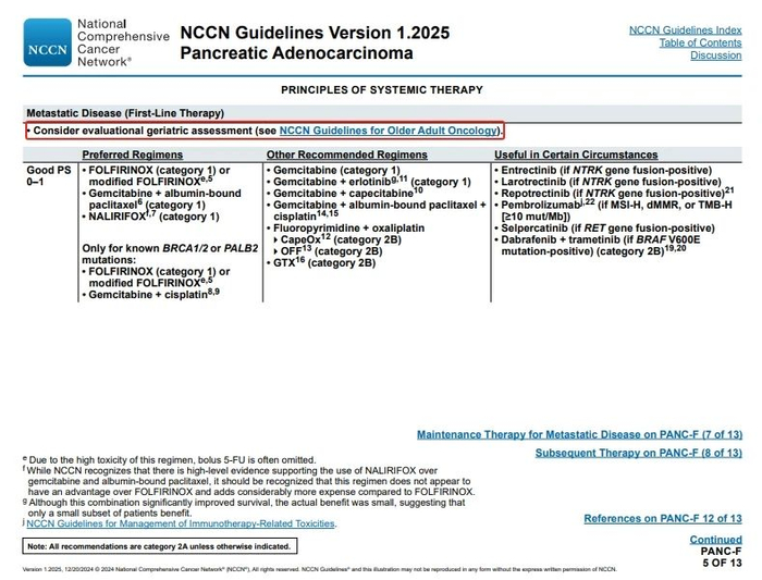 在转移性胰腺癌的一线治疗中,指南新增了考虑对老年患者进行评估性老年评估的建议(参见NCCN老年肿瘤指南)。这是基于老年患者在生理、心理和社会支持方面可能存在的差异,以及这些差异可能对治疗选择和预后产生的影响。评估性老年评估有助于医生更全面地了解患者的整体状况,从而制定更合适的治疗计划。