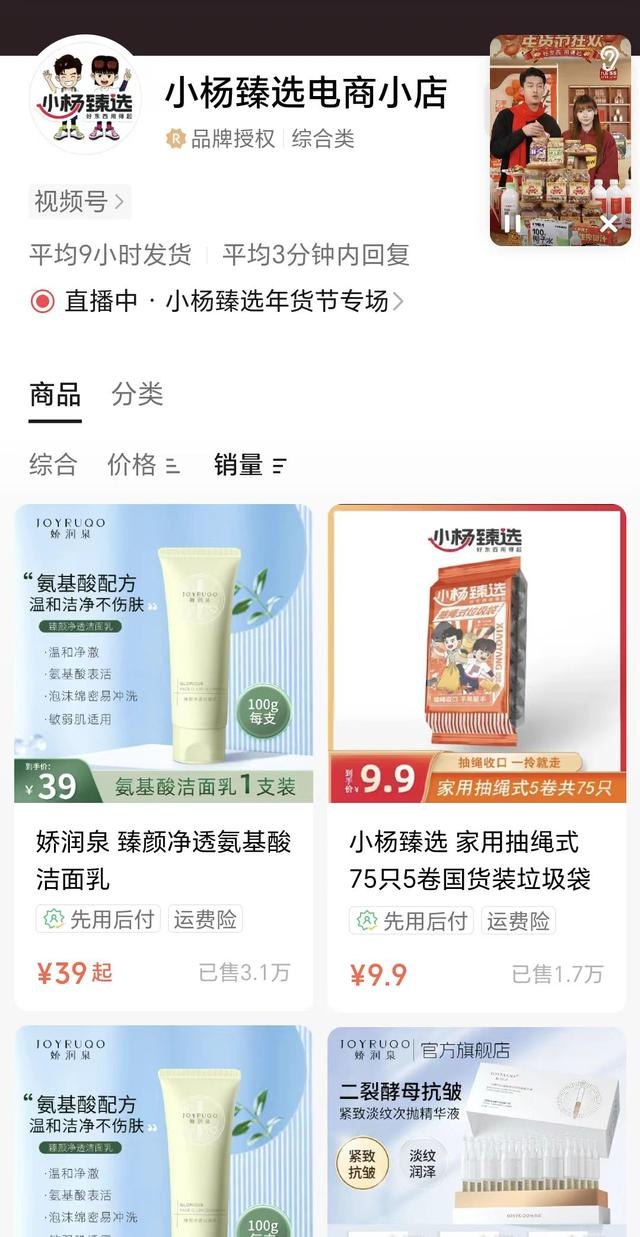账号内主营“小杨臻选”品牌商品,但也有护肤品牌娇润泉相关产品。其中,销量最好的娇润泉洁面乳、小杨臻选垃圾袋分别累计卖出3.1万件、1.7万件,店内累计销量超5000件的商品仅4款。