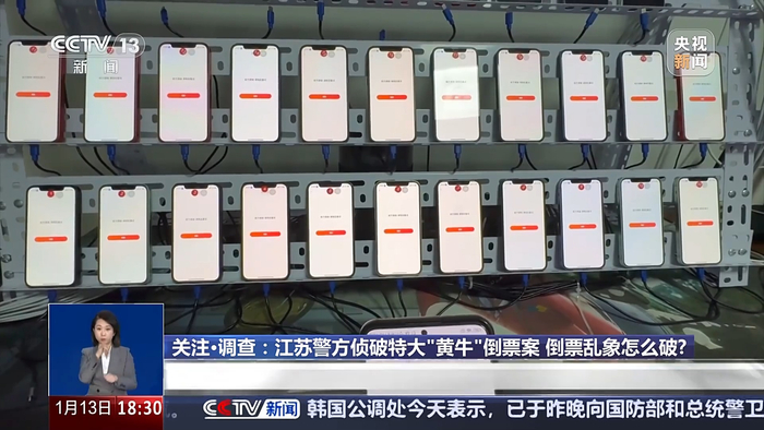 警方刚才提到了一面“手机墙”,一列列架子上,密密麻麻地码放着一部部的手机,这样的场面令人震惊,而架子上的每部手机都对应一个账号,警方形容“这就好比上百个人在帮一个人抢票”。随着犯罪嫌疑人的陆续到案,警方发现该团伙组织架构清晰,团伙成员分工明确。而购票者向“黄牛”提供的个人信息,也面临巨大泄露风险。