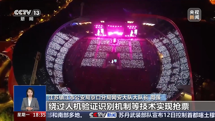 镇江市公安局京口分局网安大队民警 郭英杰:该犯罪团伙通过注册大量票务平台账号,将消费者的身份信息绑定在这些账号上,然后使用外挂软件,在未经官方授权的情况下,通过技术手段非法破解加密算法、获取相关接口,进行自动抢票。这就好比,上百个人在帮一个人抢票,极大地提高成功率。