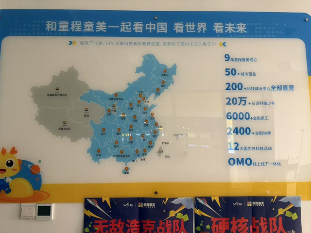 该培训机构的宣传栏,张贴着一份关于童程童美的概括:覆盖城市50+、200+科技成长中心全部直营,在读科技少年20万+、全职员工6000+、全职讲师2400+......