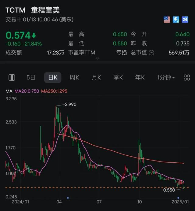 二级市场显示,1月10日,童程童美收盘于0.735美元/股,涨3.16%。不过,1月13日晚间,该股开盘暴跌超20%,总市值仅剩不到570万美元。