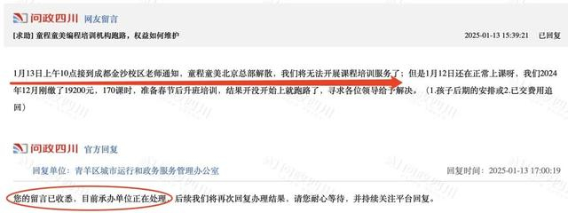 在“问政四川”网页上,有网友表示“1月13日上午10点接到成都金沙校区老师通知,童程童美北京总部解散,我们将无法开展课程培训服务”。青羊区城市运行和政务服务管理办公室回复称“目前承办单位正在处理”。