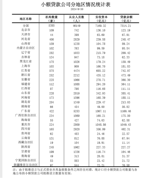 中国人民银行公布的2024年三季度小额贷款公司统计数据报告显示,截至2024年9月末,全国小贷公司数量为5385家,贷款余额达7514亿元。相较2023年年末,全国小贷公司数量减少了115家,贷款余额减少了115亿元。