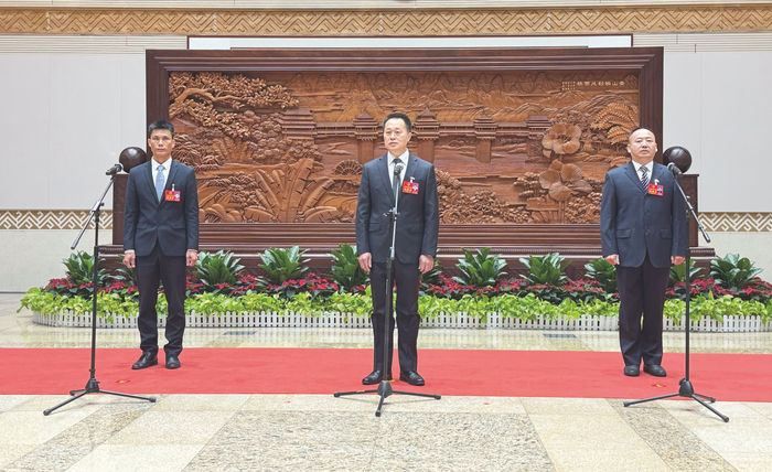 “代表通道”上,人大代表黄可明(左)、杨斌(中)、肖远贵(右)分享平陆运河建设的最新情况。