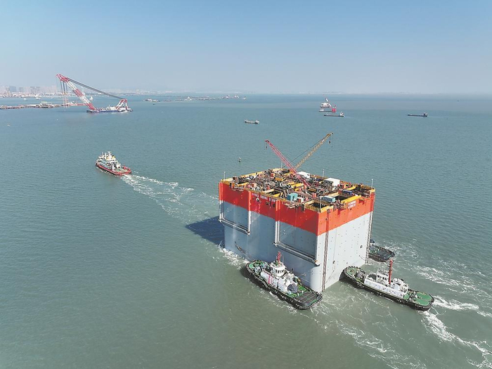 此前,东锚碇的两个钢沉井已完成海上施沉。西锚碇首个钢沉井也于2日沉放到位。此次到位的钢沉井不日将开始下沉着床等作业。