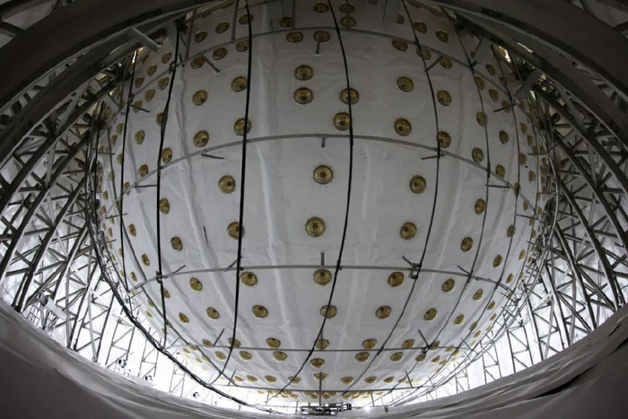 12月18日,江门中微子实验(JUNO)液体灌注启动,标志着该装置建设来到最后一个关键节点。江门中微子实验以测量中微子质量顺序为首要科学目标,并进行其它多项重大前沿研究,实验建成后将成为国际中微子研究的中心之一。图为12月16日拍摄的探测器。 新华社记者 金立旺 摄