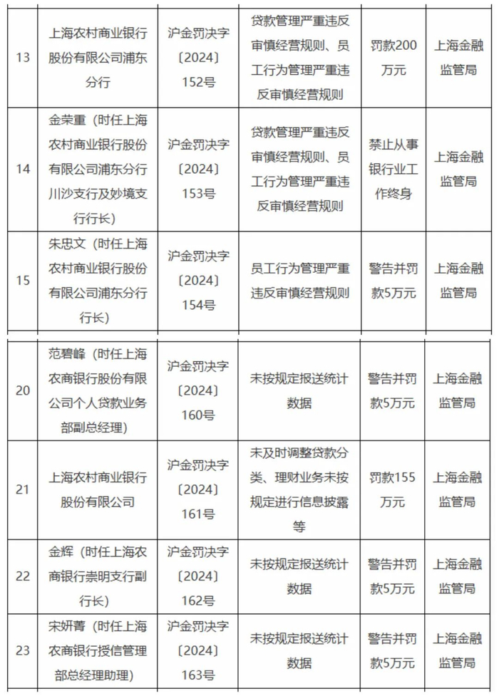 2024年12月10日,沪农商行浦东分行因贷款管理、员工行为管理严重违反审慎经营规则,被罚款200万元。时任浦东分行川沙支行及妙境支行行长金荣重被禁止从事银行业工作终身;时任浦东分行行长朱忠文被警告并罚款5万元。
