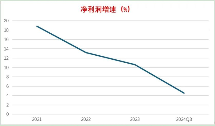 与过去三年超过10%的净利润增速相比,这一数据无疑是断崖式的下滑。2021年至2023年,沪农商行净利润分别增长18.8%、13.2%、10.6%,虽然持续走低,但一直是两位数。