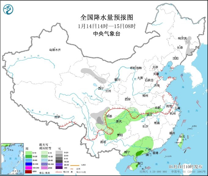图2 全国降水量预报图(1月14日14时至15日08时)