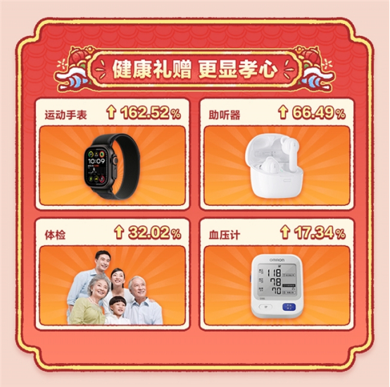 全民健康意识的持续增强,让家用医疗检测设备实现了从保健用品向送礼佳品的跃迁。在什么值得买平台内,年货节运动手表、助听器、体检、血压计GMV分别同比增长162.52%、66.49%、32.02%和17.34%,按摩仪搜索量同比增长15.16%。阿胶、鱼油、辅酶Q10、氨糖等保健品热度提升显著。