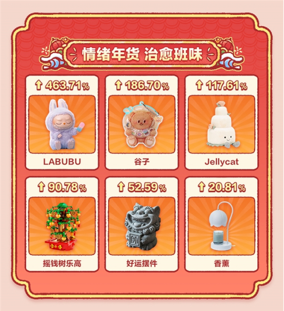 情绪消费已成为当下市场消费密码,无论是可爱解压的毛绒玩具,还是祈祷好运的招财摆件,都在年货节期间迎来爆发。其中,LABUBU、谷子、Jellycat分别作为IP、品类和品牌代表,GMV分别同比增长463.71%、186.70%和117.61%,摇钱树乐高GMV也同比增长90.78%。