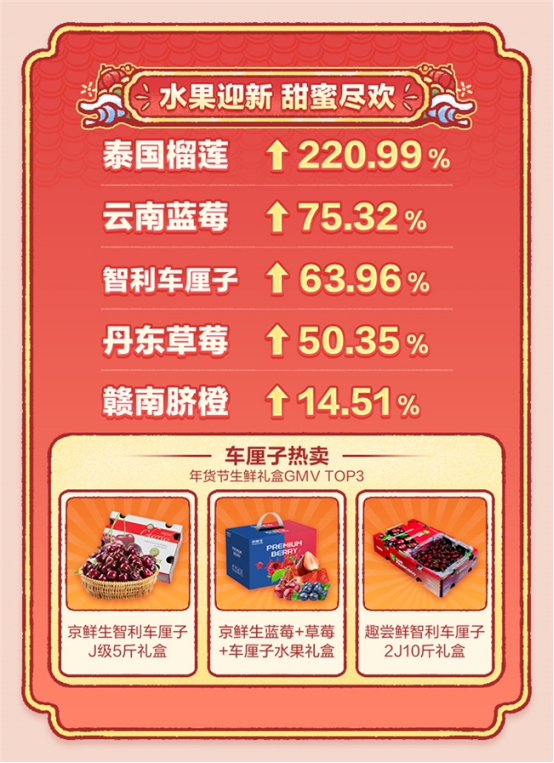 春节进入倒计时,水果消费迎来高峰。年货节期间,泰国榴莲、云南蓝莓、智利车厘子GMV同比增长220.99%、75.32%和63.96%,霸榜水果品类GMV前三。在采购年货礼盒时,口感美味、价格亲民的车厘子受到消费者广泛青睐,包揽什么值得买生鲜礼盒GMV TOP3。
