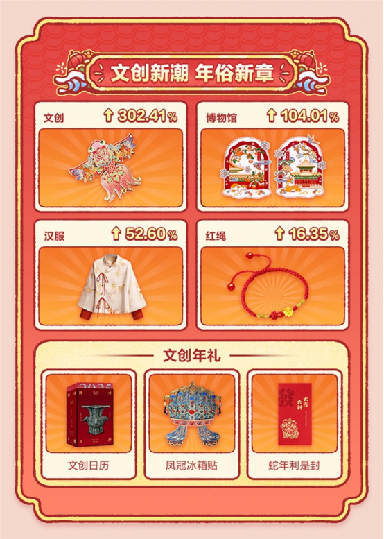 随着新一代消费者文化自信的持续增强,过节穿汉服、逛博物馆已成为一道“新年俗”,平台博物馆、汉服、红绳等饱含民族文化风情的商品GMV分别同比增长104.01%、52.60%和16.35%,文创也在今年崛起,GMV同比增长302.41%,凤冠冰箱贴、蛇年利是封成为品类销冠,过去常出现在纪录片里的文化符号已经成为年轻人感受新春的新方式。