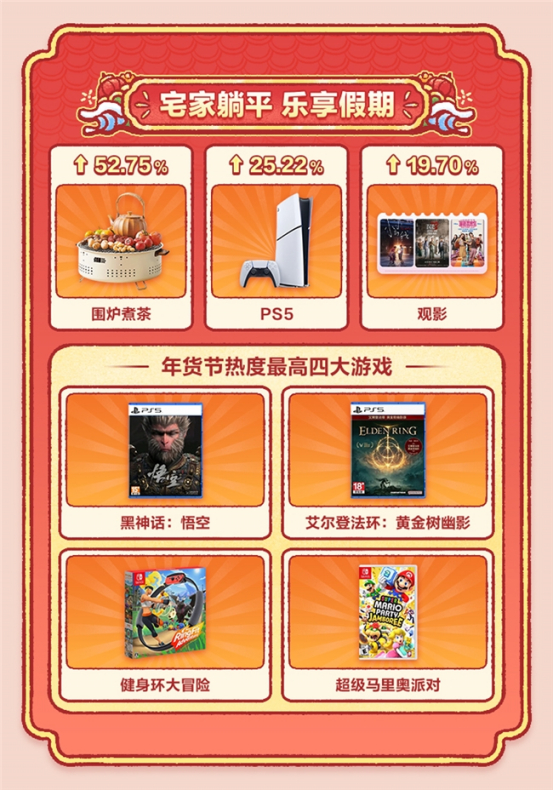 除了出游打卡外,也有不少人选择宅家“躺平”过年。三五好友围坐,一壶热茶慢品,这种慵懒的诗意生活让围炉煮茶成为冬日里火热的休闲方式,平台相关GMV同比增长52.75%。打游戏、看电影作为假期经典项目,年货节期间也迎来一波销量高峰,PS5和观影券GMV分别同比增长25.22%、19.70%,《黑神话:悟空》稳居冠军。