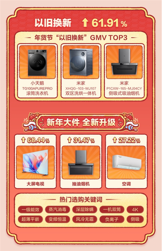在政策持续加码下,自12月24日以来,什么值得买平台内大屏电视、抽油烟机和空调GMV分别同比增长68.44%、31.47%和27.22%,小天鹅TG100APURE Pro滚筒洗衣机、米家XHQG103MJ107双区洗烘一体机和米家P1 CXW-165-MJ04CY侧吸式吸油烟机成为最受欢迎的三款大家电,消费者纷纷直呼价格“真香”。一级能效、蒸汽消毒、超薄平嵌、变频恒温等成为消费者选购时提及最多的关键词。