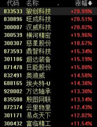 三花智控,汉威科技、弘讯科技、东方精工、爱仕达、五洲新春、巨能股份等20余股涨停,慈星股份、鼎智科技、埃夫特等多股涨超10%。