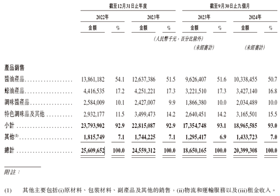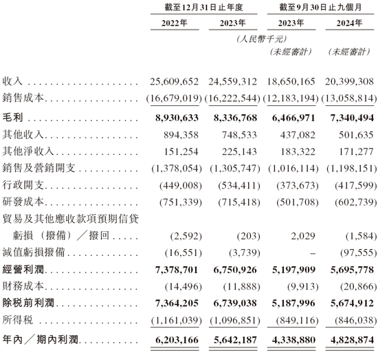 招股书显示,在过去的2022年、2023年和2024年前九个月,海天味业的营业收入分别为人民币256.10亿、245.59亿和203.99亿元,相应的净利润分别为人民币62.03亿、56.42亿和48.29亿元。