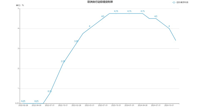 面对经济下行的压力,欧洲央行在2024年12月决定将三大关键利率各下调25个基点,作为自去年6月以来的第四次降息措施。调整后,欧元区的存款机制利率、主要再融资利率以及边际借贷利率分别设定为3.00%、3.15%和3.40%,其中存款机制利率累计已下调75个基点。