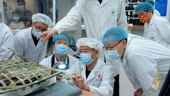 此外,《重返三星堆》还别出心裁地采用了悬念叙事手法,设置考古工作中的各种障碍,强调文物修复的难度以及谜团破解的曲折,由此增加故事的戏剧性及悬念感。以考古学界与观众都极为关注的三星堆文字问题为例,《重返三星堆》以7号坑出土的青铜龟背状网格形器的室内清理工作为切入点,围绕龟背状玉器以及包裹玉器的丝绸可能存在人们期待出现的文字或符号,结合8号坑青铜凤鸟柱头上的墨画纹饰,大篇幅展现了一线考古工作者对三星堆文字问题展开的讨论与分析,生动有趣,引人入胜。