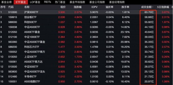 ETF也在持续放量,以华泰柏瑞沪深300ETF为例,14日上午,沪深300ETF成交量已经超过前一个交易日全天,截至收盘,华泰柏瑞沪深300成交量近64亿元,易方达创业板ETF、华夏科创50ETF成交量均超过55亿元,而国泰基金、华夏基金以及南方旗下3只中证A500ETF成交额均超过或接近40亿。