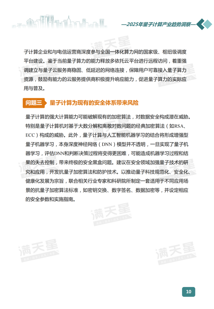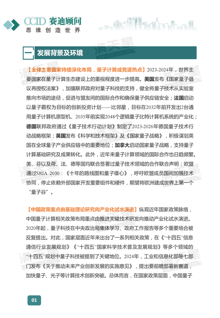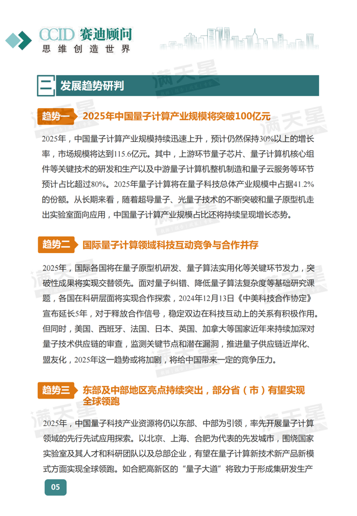 纵观近年国家政策脉络,中国量子计算相关政策布局重点由推进关键技术研发向推动产业化试水演进。联合国宣布2025年为“量子科学与技术之年”。当前量子计算在技术研发层面已取得诸多瞩目成果,量子比特的操控精度、稳定性等关键指标不断提升,广泛的实际应用需求也日趋明确。站在2025年的起点,展望未来,赛迪顾问认为2025年量子计算将呈现如下十大趋势: