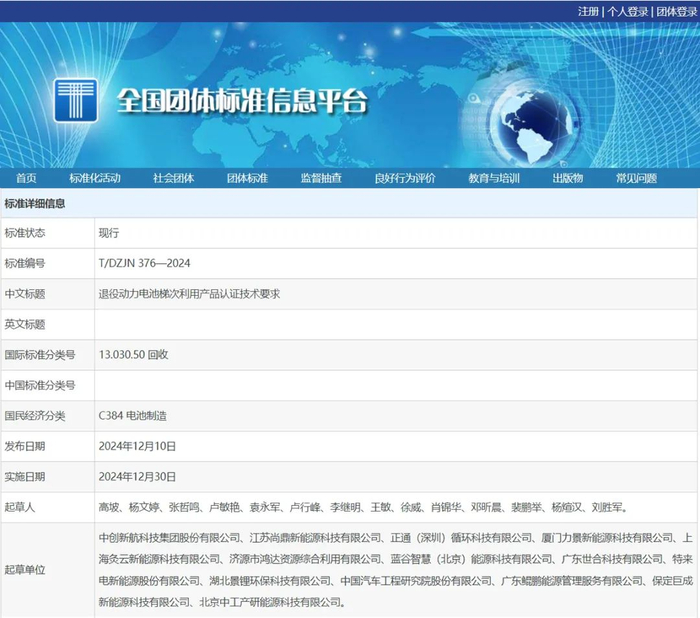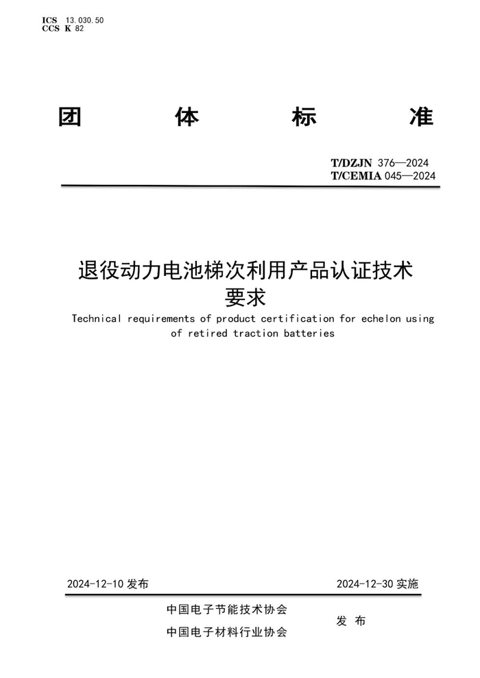 本网记者从中电能协电池回收利用专业委员会获悉,由电池回收利用委员会提出,中创新航科技集团股份有限公司牵头起草的《退役动力电池梯次利用产品认证技术要求》团体标准2024年12月10日正式发布,将于2024年12月30日正式实施。