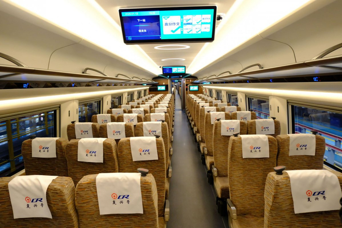 CR400AF-S复兴号智能动车组亮点颇多,如二等座车厢座席排数由18排增加至19排,具有轻量化、降噪等新技术和设备集成,优化布局;一、二等座车厢均增设大件行李存放处,存放空间扩大一倍,相较和谐号动车组容积更大。在二等座座椅靠背处,设USB接口,座椅下方新增“Type-C”接口,充电更加方便,满足旅客不同设备充电需求;一等座车厢在扶手和座椅前方均配备小桌板,方便旅客临时放置小件物品。