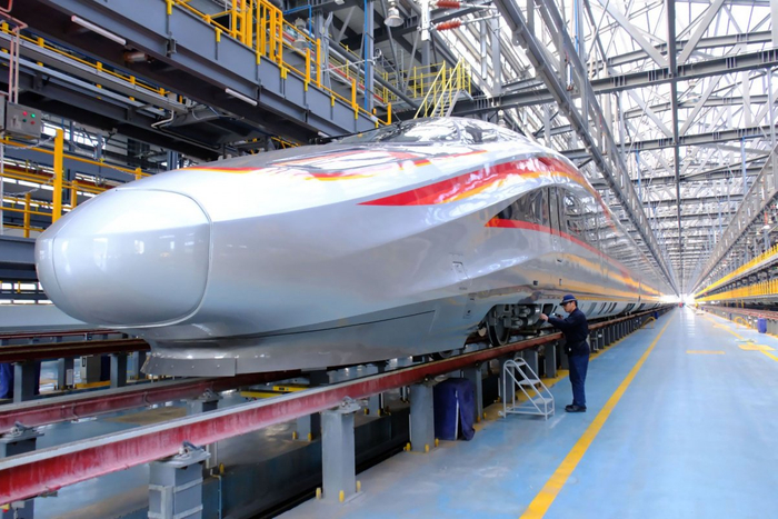 当日,在南宁动车所检修库,一列复兴号智能动车组列车停靠在线上检修,车体有着“瑞龙智行”涂装。据悉,该复兴号智能动车组外观灵感来源于中国传统文化的“龙凤图腾”“舞龙”等意象,寓意科技创新引领中华民族伟大复兴、中国高铁领先世界造福人类,表达了对祖国繁荣昌盛、人民幸福安康的美好祝福。