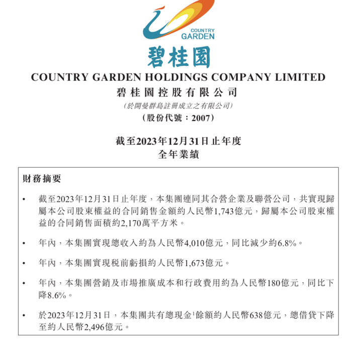 1月14日晚间,碧桂园挂出2023年业绩和2024年中期业绩,数据显示,2023年该公司实现总收入约4010亿元(人民币,下同),同比减少约6.8%。同时,2023年实现税前亏损约1673亿元。